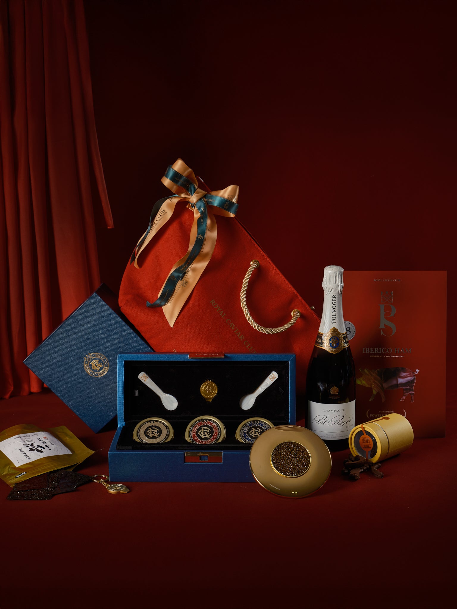 The ultimate gift for caviar connoisseurs. This premium hamper features the Classic Trio Box Gift Set — Premium Baerii Caviar, Imperial Ossetra Caviar, and Royal Cristal Caviar (each 30g) — with 2 mother of pearl spoons and tin opener. Also includes a Small Caviar Ring (exquisite stainless steel or 24K gold-plated), 100% Bellota Iberico ham (100g), RCC Premium Japanese Seaweed, dark chocolate orange strips, and your choice of Pol Roger or Dom Pérignon champagne. A complete caviar tasting experience for serious enthusiasts.