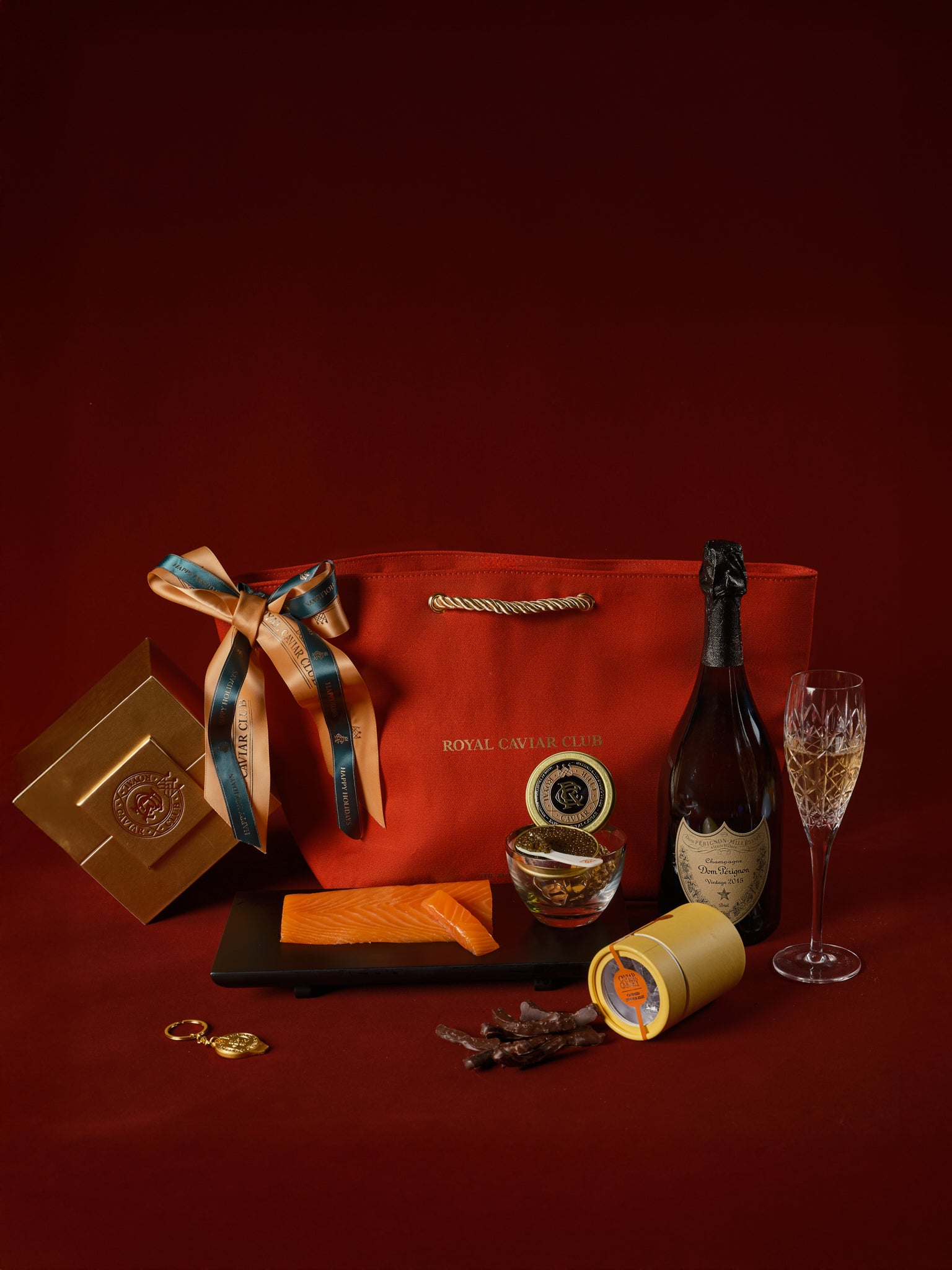 A gourmet pairing of caviar and premium Scottish smoked salmon. This elegant hamper includes Royal Cristal Caviar (30g), Pure Selection Scottish Smoked Salmon (150g), Signature Gold Box with mother of pearl spoon and tin opener, dark chocolate orange strips, and your choice of Pol Roger Brut Reserve NV or Dom Pérignon 2015 champagne (750ml gift box). The ultimate luxury seafood gift for discerning food lovers in Hong Kong.